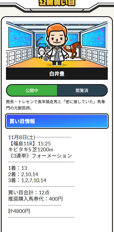 2025年11月9日(日)、東京12Rの三連単9点、1点600円という白井豊さんの有料情報を利用。