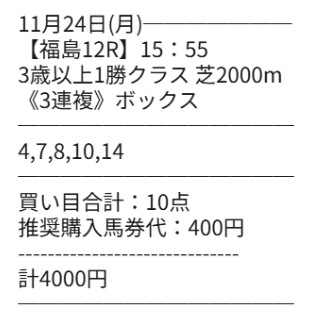 前日の福島2Rに続き、11/16福島7Rもバイアスナビを購入。ここが本当にヤバかった…。結果は13-14-15で3連単158,940円。フォーメーション9点×1点600円=5,400円の勝負で、払戻は953,640円とミリオン目前。2日連続でこのレベルの配当を引きずり出すのは、もはや“偶然”では片づけられません。トリガミ覚悟で広げるのではなく、「当てにいきながらも配当を最大化する配置」になっていて、本物のプロ集団だと感じました。